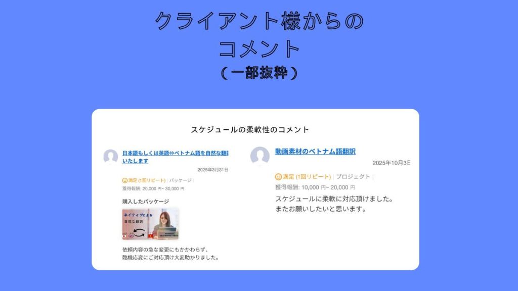 お急ぎの場合は可能な限り、ご希望に沿って対応いたしますので、お気軽にお声がけください。日本語とベトナム語の両ネイティブから翻訳&校正のダブルチェック体制を整えていますので、クオリティは保証いたします。