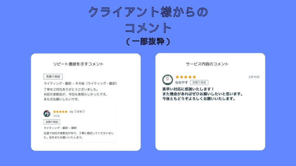 個人事業主としてこの翻訳サービスをしているので、依頼内容についても個人ならではの柔軟さ・スピーディーな対応が可能です!